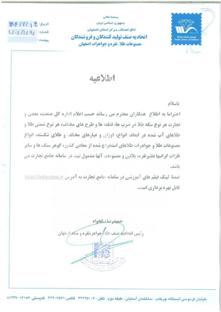 <img src="https://etjesf.ir/wp-content/uploads/2025/10/Notice-about-the-requirement-to-register-coins-and-coins-in-the-comprehensive-trading-system-724x1024.jpg" sizes="(max-width: 724px) 100vw, 724px" srcset="https://etjesf.ir/wp-content/uploads/2025/10/Notice-about-the-requirement-to-register-coins-and-coins-in-the-comprehensive-trading-system-724x1024.jpg 724w, https://etjesf.ir/wp-content/uploads/2025/10/Notice-about-the-requirement-to-register-coins-and-coins-in-the-comprehensive-trading-system-212x300.jpg 212w, https://etjesf.ir/wp-content/uploads/2025/10/Notice-about-the-requirement-to-register-coins-and-coins-in-the-comprehensive-trading-system-768x1086.jpg 768w, https://etjesf.ir/wp-content/uploads/2025/10/Notice-about-the-requirement-to-register-coins-and-coins-in-the-comprehensive-trading-system-750x1061.jpg 750w, https://etjesf.ir/wp-content/uploads/2025/10/Notice-about-the-requirement-to-register-coins-and-coins-in-the-comprehensive-trading-system.jpg 905w" alt="" width="724" height="1024" />